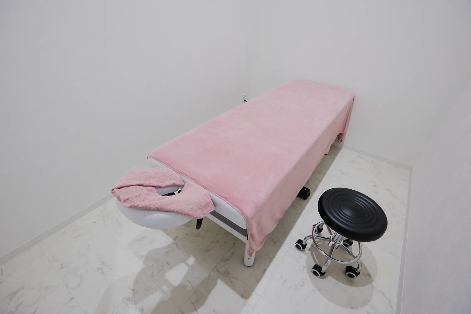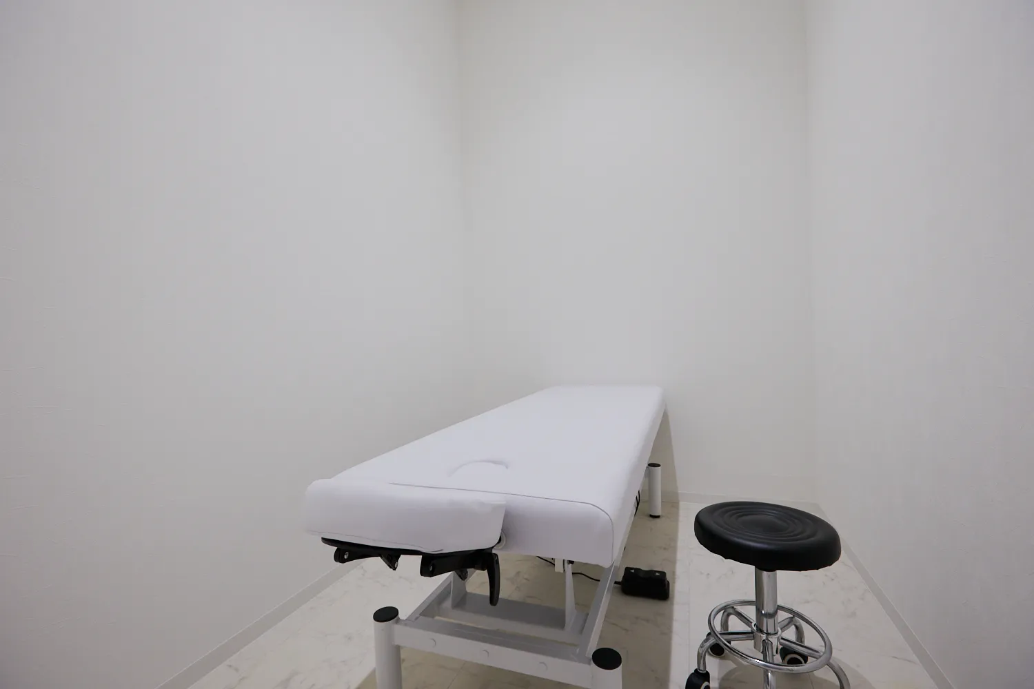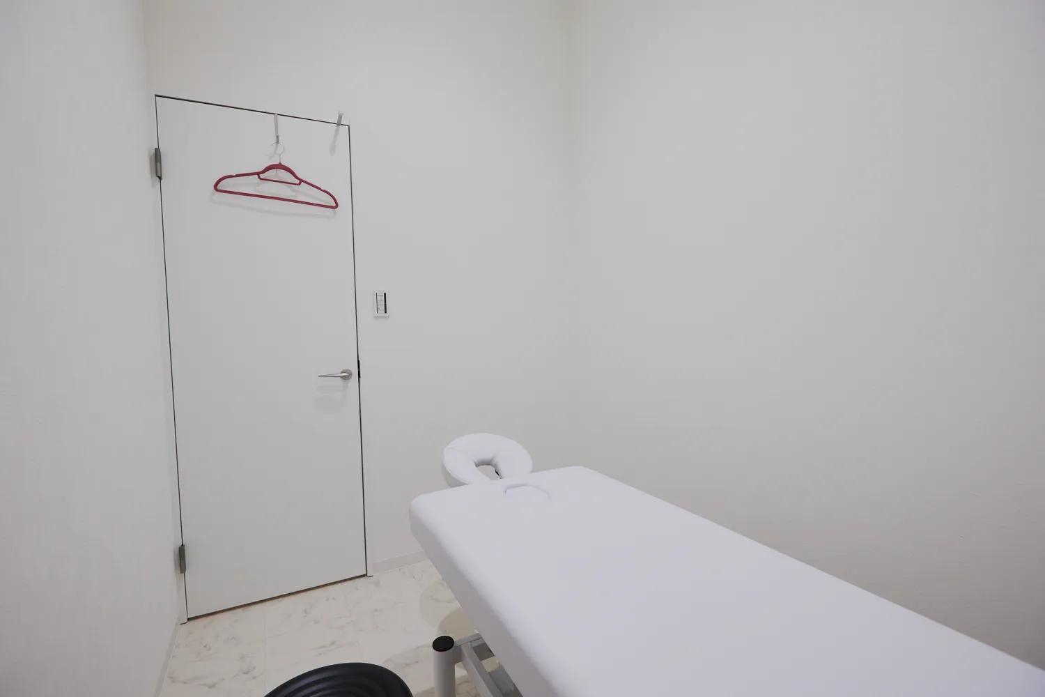 広さ:6畳/設備:施術ベッド、タオルウォーマー、収納棚など